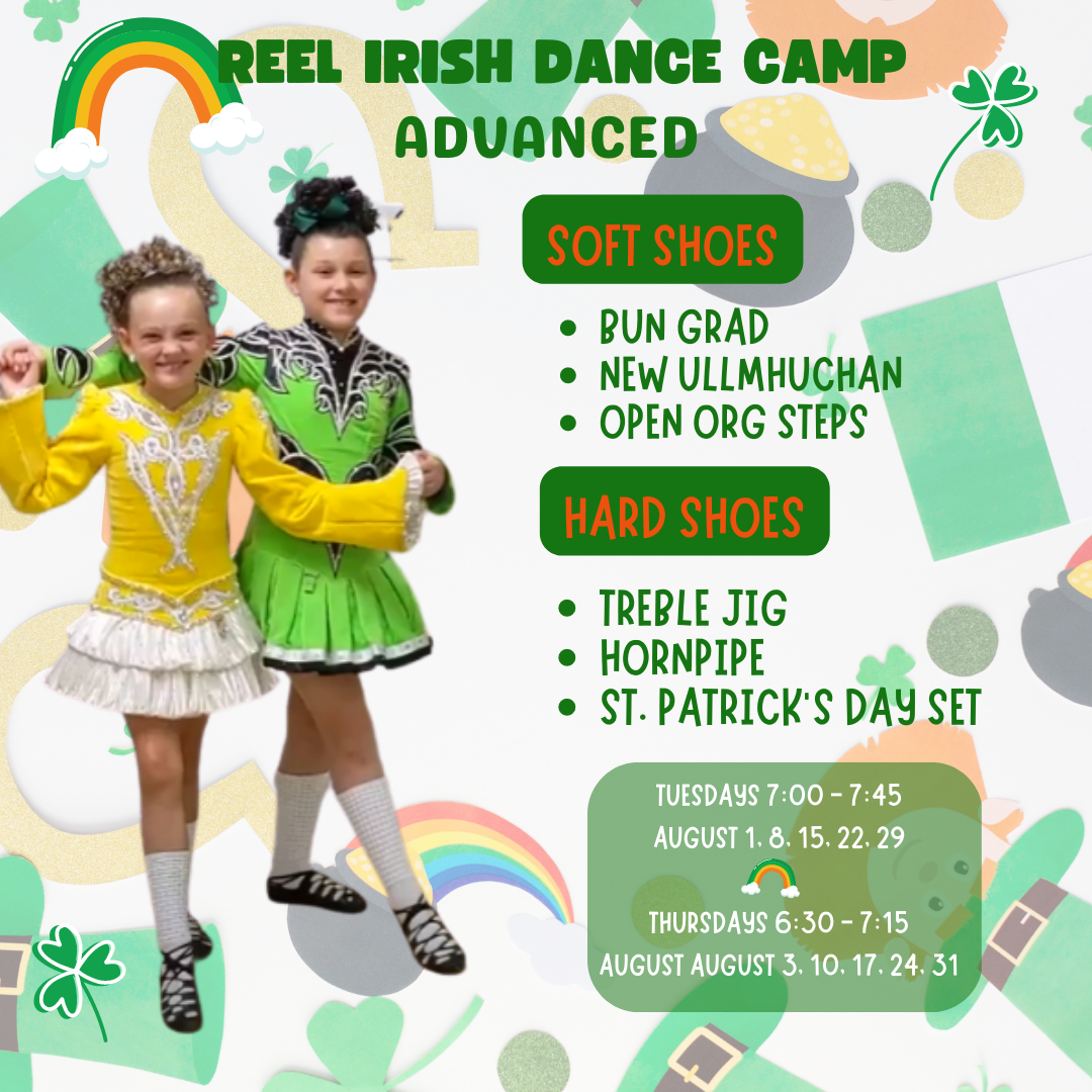 Reel Irish Dance Camp Advanced - This is for dancers that have some Irish Dance experience or at least 1 season of classes with McGovern Irish Dance. Dancers will continue to work on their Bun Grad and Open Organization steps as well as beginning Ullmhuchan and Hard shoe work so they are ready to start strong in September!