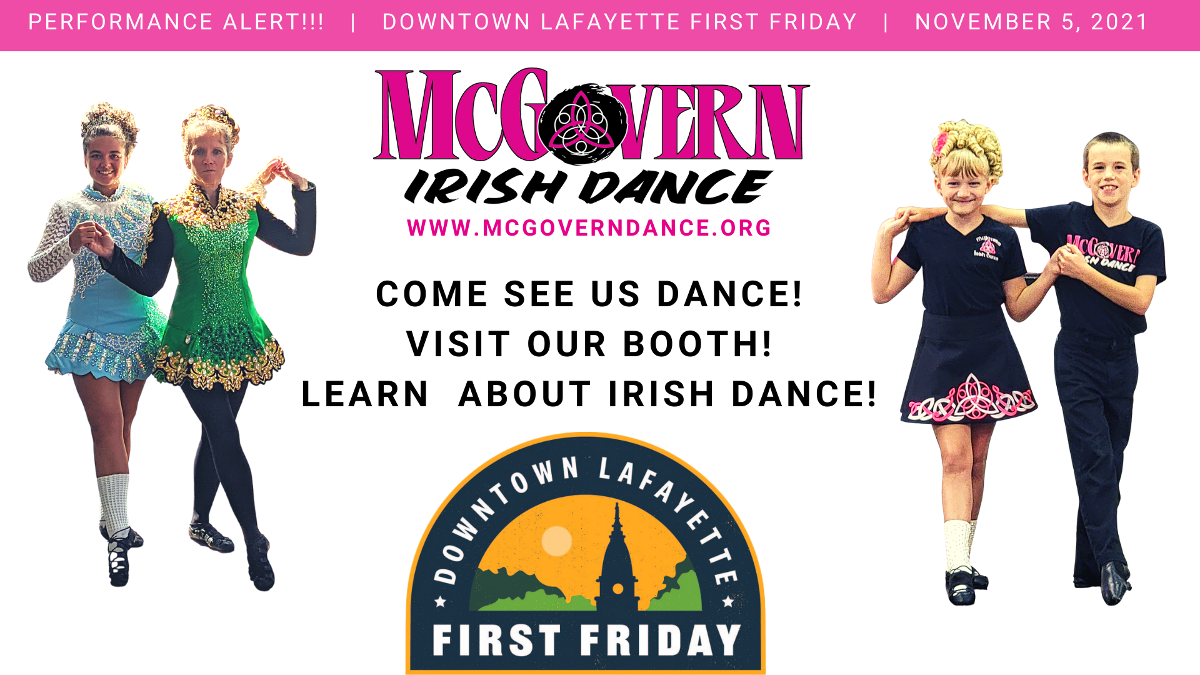 We have been asked to exhibit at the First Friday Lafayette on Nov 5. I will need dancers available for demos and performances as well as parents to help work the booth. (parents will need black pink white outfits or MID gear to work the booth) Our event area will be near Long Theatre or Duncan Hall, that has yet to be determined. DARBT is 6:00 for dancers 5:30 for booth workers.