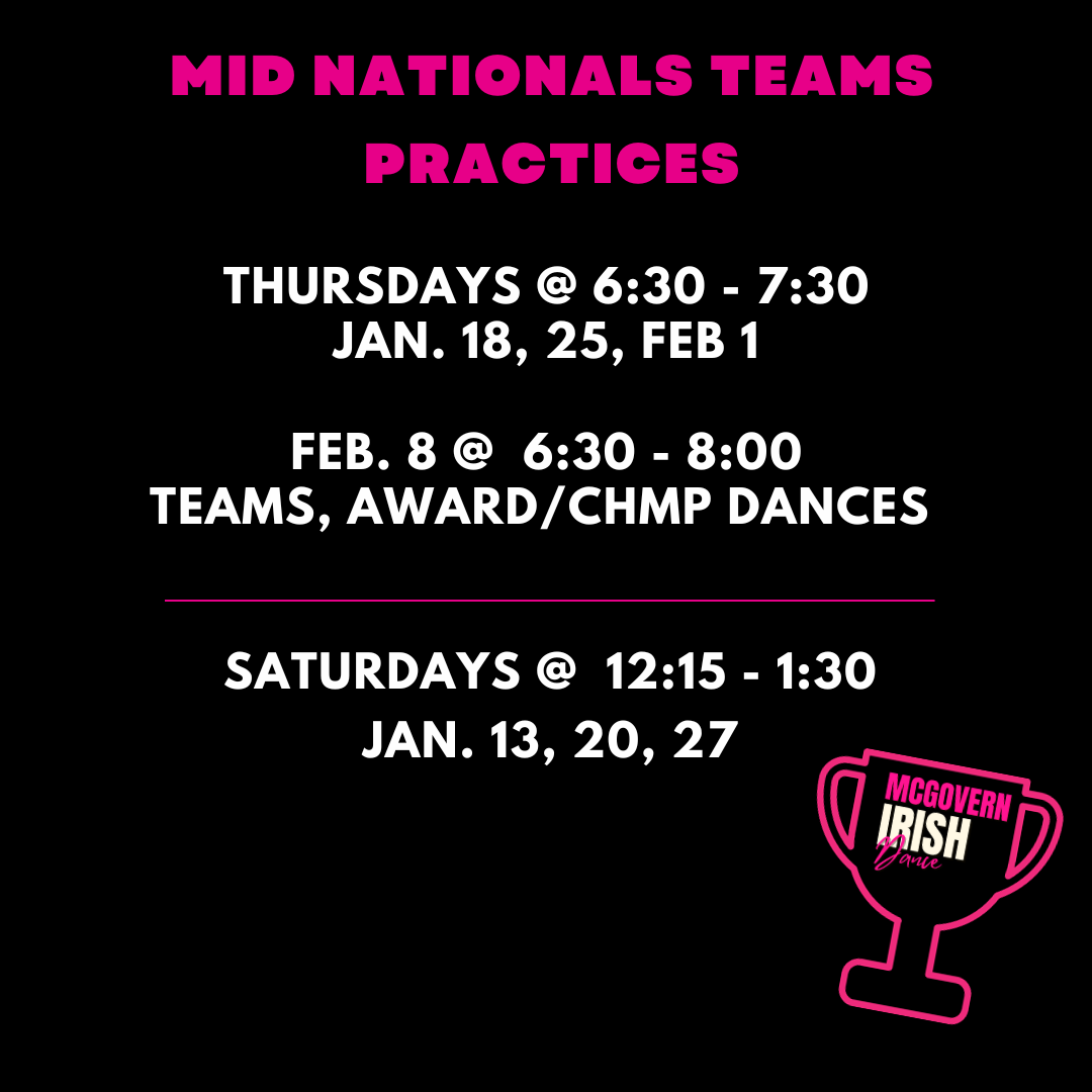 Please bring your black white and pink MID gear for the workshops, NOT competition shirts, NOT St. Patrick's shirtsYou will be participating as a dancer as well as an instructor and I want us to look like a team and professional, If you don't have "Official" MID gea then plain black white or pink clothing