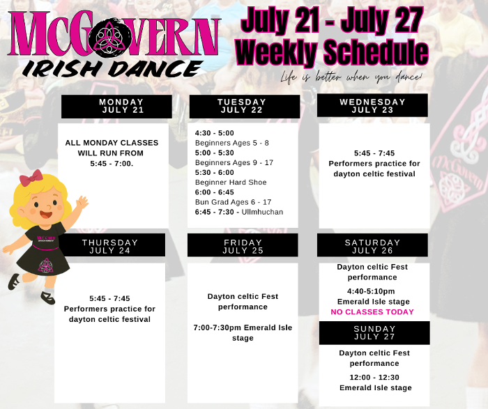 It’s here—Dayton Celtic Festival week! This is one of our most exciting times of the year, and we’re so thrilled to see our dancers take the stage and represent McGovern Irish Dance with pride and energy. Make sure you are sharing out our social media posts about the performances, take lots of pictures before during and after the festival and tag @mcgovernirishdance, @unitedirishofdaytn, @daytoncelticfestival, @friendsoftheirish