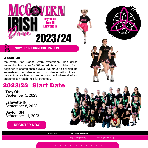 MCGOVERN IRISH DANCE WEEKLY NEWSLETTER WEEK OF August 28 - September 3, 2023 SAVE THE DATE Sept 1 - Sept 5 - Labor Day Break (Troy starts on Sept 5) Sept. 5 @ 6:30 - 7:30 Troy OH Studio Open House And New Season Start Sept. 9 @ 11:15 - 12:00 Lafayette IN Studio Open House Sept. 16 - Global Fest Performance - Lafayette IN Sept. 30 - Indian Lake Moose Oktoberfest Aug. 12 1:30 - 3:30 Dayton Studio Open House October 7 - 8 - CRN West Region Regional...