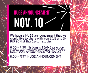 We have a HUGE announcement that we would like to share with you LIVE and IN PERSON at the Dayton studio. We will FACEBOOK live in McGovern Irish Dance Parent Connection facebook group for our Lafayette IN dancers. We will then share the video and info publicly, I ask that ALL OF US wait to post anything after the announcement until it goes LIVE publicly. On November 10 we will have an altered schedule to encompass TEAMS practice and the HUGE ANNOUNCEMENT and of course a celebration. If you are...