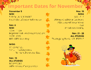Holidays are coming and the schedule tends to get a little topys turvy. I will try my best to keep you up to date on any changes. Feel free to contact me with any questions or to set up make up classes if needed. Shelagh [email protected] Text/Call (937) 321-6687 PS I noticed I managed to leave off the the FINAL WORKSHOP before WIDA Nationals - mark your calendars for Nov 7 2PM - 5PM.