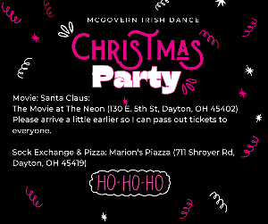 Get Ready for Christmas Cheer at McGovern Irish Dance! The holiday season is upon us, and we’re ready to celebrate with all of you! Our Christmas parties and festive classes are just around the corner, filled with dancing, games, snacks, and plenty of holiday fun! Mark Your Calendars: Ohio Families: Don’t forget to RSVP for the Ohio Christmas Party! This helps us prepare for a wonderful event everyone can enjoy. Dayton & Troy Dancers: Be sure to check your class schedules—these will have a special holiday twist...